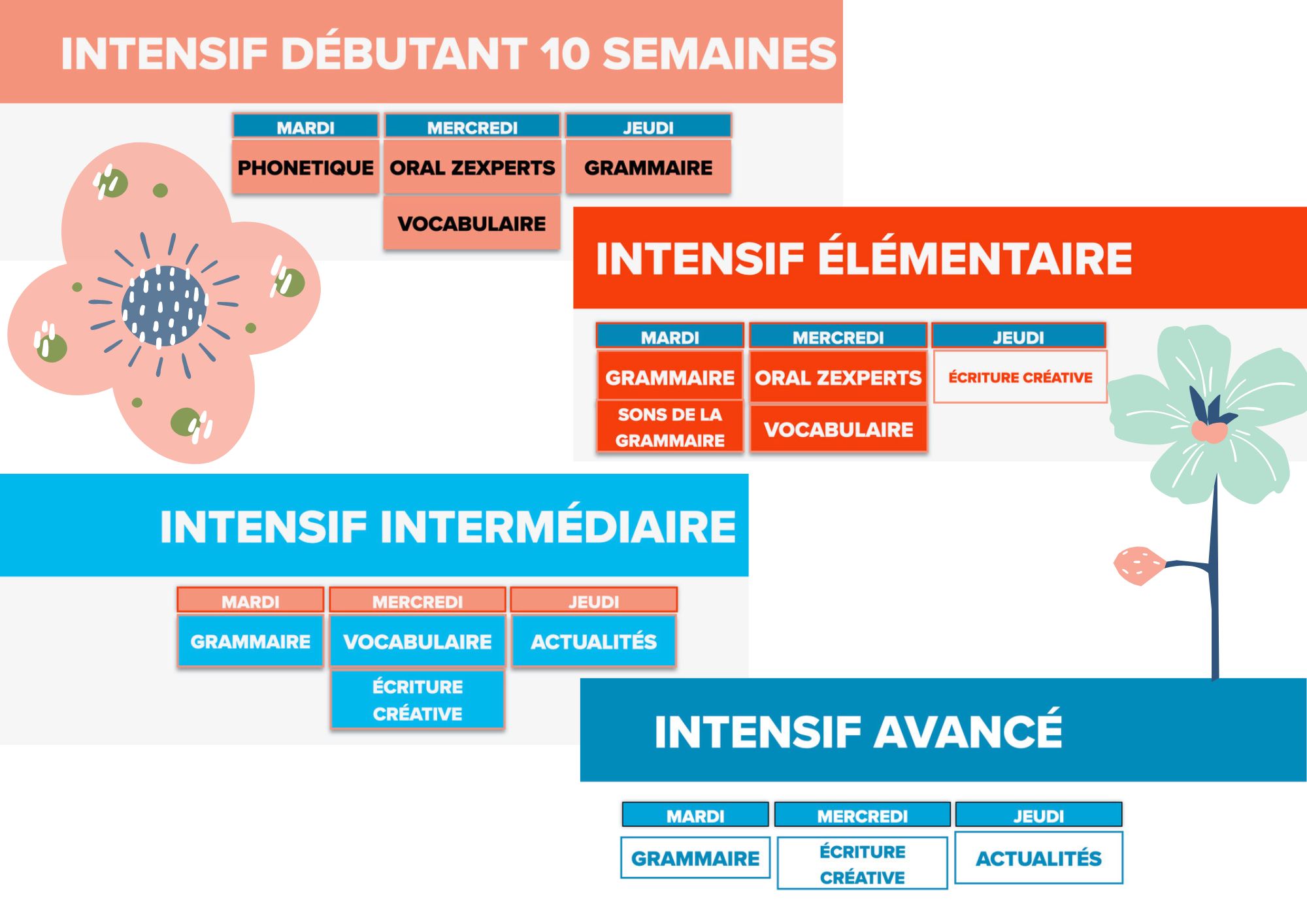 Standard course + 3 sessions per week to revise and deepen your grammar, enrich your vocabulary, work on your pronunciation, improve your writing and enrich your knowledge of French culture and society.